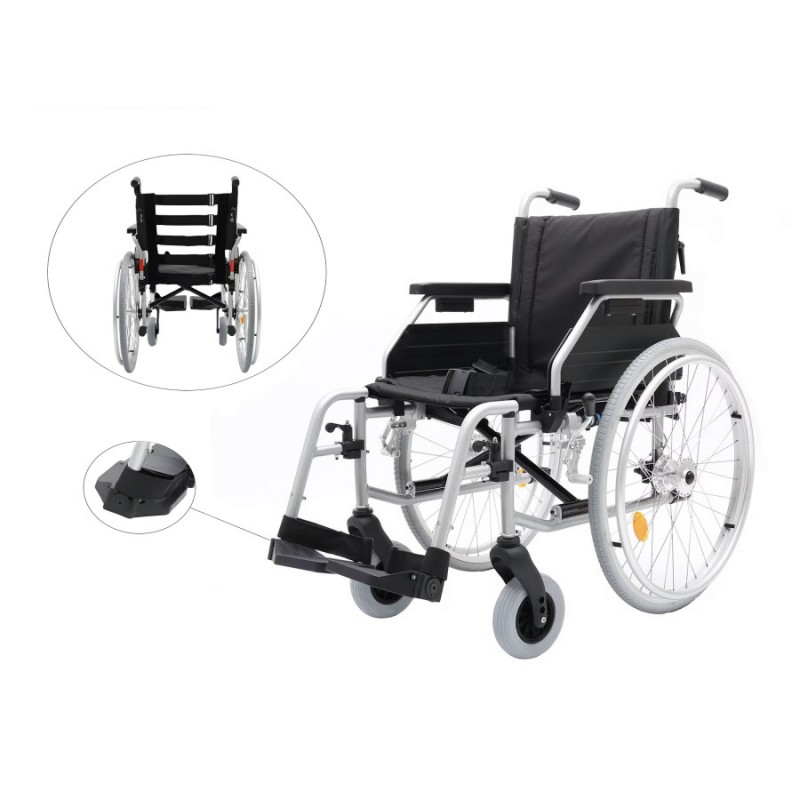 - Колеса: задние — пневматические (для ширины сиденья 39 см, 42 см, 45 см) или полиуретановые (для ширины сиденья 48 см, 51 см), быстросъемные, диаметром до 610 мм, что обеспечивает хорошую проходимость на различных покрытиях. Передние колеса полиуретановые диаметром 178 мм.