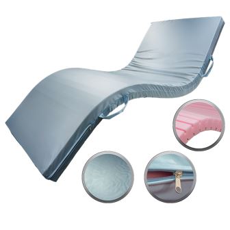 Матрац изготовлен из эластичного пенополиуретана марки А со специальным П-образным профилем, который придает матрацу дополнительную эластичность для функционального использования в комплекте со специальными, 2-3-4-5-ти секционными медицинскими кроватями. Уникальный, П-образный поперечный профиль позволяет ему принимать форму ложа, 1-2-3-4-5-ти секционной кровати. Влагонепроницаемый съемный чехол матраца изготовлен из мембранной, синтетической ткани (ПЭ трикотажная сетка) с влагонепроницаемой термопластичной полиуретановой мембраной, общая плотность ткани 150 г/м² . На чехле по центру торцевой части вшита П- образная молния, защищеная клапаном.
