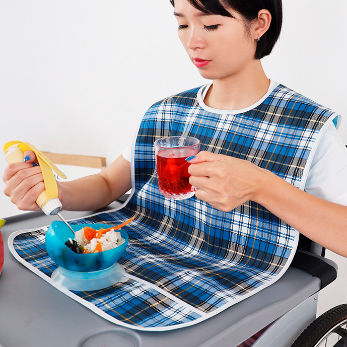 Нагрудник для взрослых защищает постель и одежду пользователя во время приема пищи.