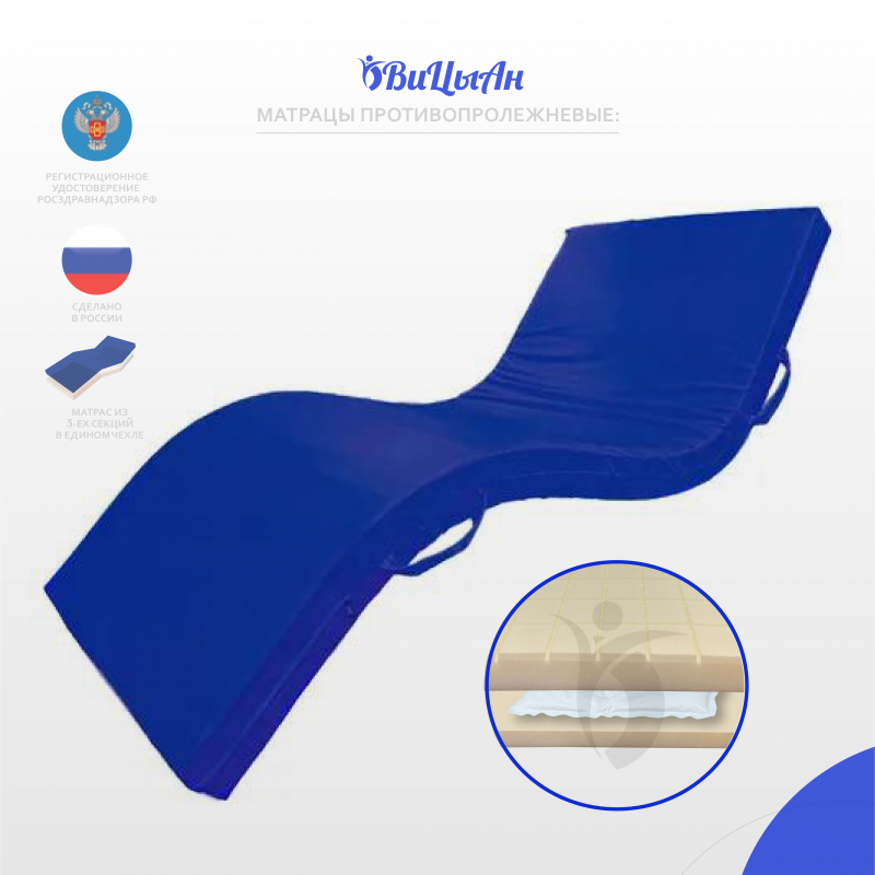 Матрац предназначен для людей с нарушением функций опорно-двигательного аппарата и нервной системы в целях предотвращения пролежней. Профилактика пролежней при длительном лежании. Обеспечение максимального комфорта. Комплексная реабилитация лечения пролежней. Для комфортного сна. Имеет направление положения тела (указана последовательность сборки в чехол вшита бирка со стороны головы).Противопролежневый матрац гелевый состоит из трех формообразующих секций изготовленный из вязкоэластичного латексированного пенополиуретана. Верхняя сторона имеет профиль в виде квадратных подушечек, матрац имеет три секции.. Наполняемость внутреннего объема, гель (упругоперетекающие гелевые элементы). Каждый блок (секция), зачехлен в чехол из нетканного материала. Допустимая нагрузка 120 кг. Съемный влагонепроницаемый чехол матраца, комбинированный на молнии, изготовлен из материала двух видов ТК-1/1 / ТК-7 (Основа – высокоэластичная трикотажная сетка, верхний слой – прозрачное водонепроницаемое термопластичное полиуретановое мембранное покрытие/синтетический материал с полиуретановым пленочным покрытием) В чехол вшита молния. Материал чехла (состав): 82% полиэстер, 18% полиуретан/100% полиэстер Плотность ткани чехла, г/м²: 125/210. Матрац упакован в картонный короб с полиэтиленовым вкладышем.1. Благодаря уникальной конструкции матрац равномерно распределяет нагрузку тела на поверхности ложа создавая благоприятные условия для полноценного лечения.2. Верхний профиль наполнителя формирует между собой воздушные каналы, создавая вентиляцию, что значительно увеличивает срок эксплуатации.3. Съемный чехол легко снимается, поэтому осуществлять надлежащий уход и своевременную обработку, дезинфекцию, стирку и сушку (в зависимости от загрязнения) можно многократно. 4. Не имеет швов на рабочей поверхности5. Молния защищена влагонепроницаемым клапаном6. Благодаря водонепроницаемому покрытию, жидкость с поверхности чехла легко удаляется и не проникает во внутрь изделия.7. Специальная антибактериальная обработка, защищает от распространения бактерий.8. Эластичность чехла позволяет не вызывает ответного давления и способствует равномерному распределению массы тела на поверхности ложа.9. Антискользящая поверхность препятствует скатыванию постельного белья10. Высокая паропроницаемость