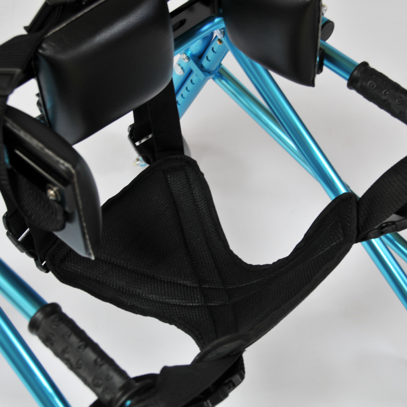 Фиксатор таза ( поддерживающие трусики) выполнен из мягкого и дышащего материала и крепится на раме ходунков с помощью регулировочных ремней.