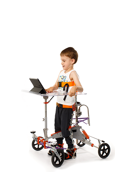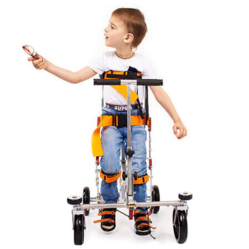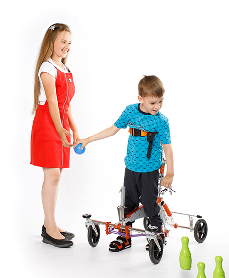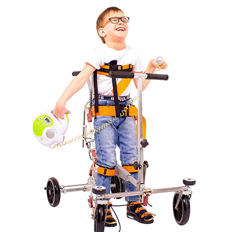 Реабилитационный тренажер ЭкзоБот предназначен для тренировки самостоятельной ходьбы детей, которые имеют заболевания опорно-двигательного аппарата. ЭкзоБот представляет собой динамическую платформу на колесах с различной грузоподъемностью, к которой с помощью системы специальных креплений ребенок фиксируется в тазобедренной и грудной частях тела, а нижние конечности установлены в экзо-ортез. Перемещение осуществляется с помощью специальных эластичных тяг, расположенных в области коленного сустава и голеностопа. Благодаря им создается необходимый уровень усилия для приведения нижних конечностей в нормальное движение. Гибкая система настройки позволяет отрегулировать аппарат под индивидуальные особенности ребенка, в зависимости от его роста, веса, двигательных навыков и степени необходимой нагрузки на нижние конечности.