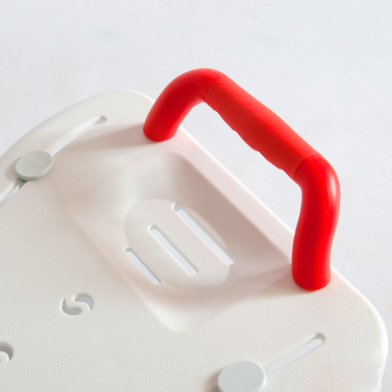 Сиденье выполнено из легкого и прочного пластика с рифленой поверхностью и дренажными отверстиями для стекания воды. На поверхности сиденья есть специальная выемка для мыла, мочалки или других принадлежностей. Сиденье оборудовано вращающимся диском, который облегчает перемещение пользователя во время водных процедур.