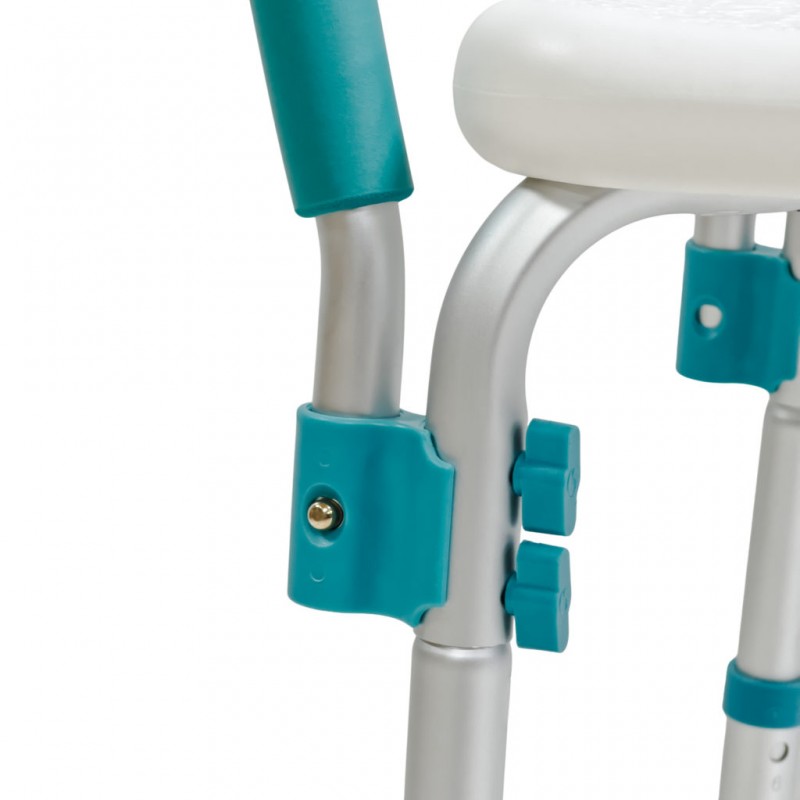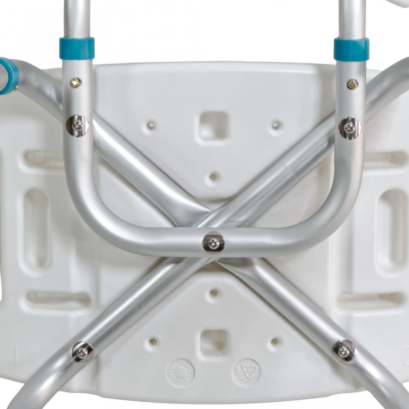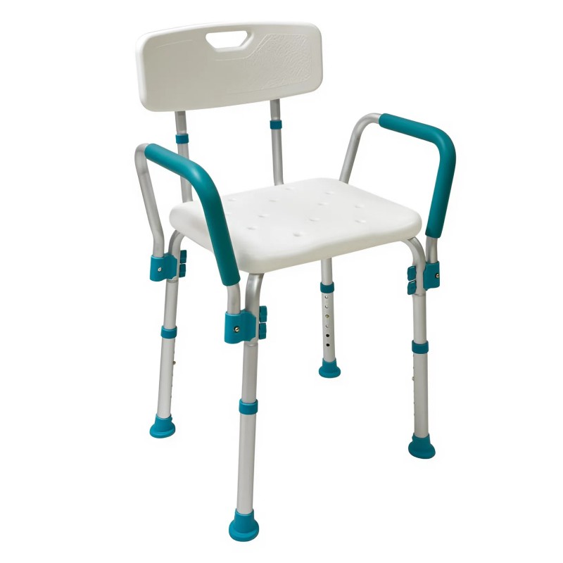 Конструкция стула выполнена из прочного алюминиевого каркаса, устойчивого к влаге и коррозии. Сиденье и спинка изготовлены из нескользящего пластика с дренажными отверстиями для быстрого стока воды. Высота ножек регулируется, что позволяет адаптировать изделие под индивидуальные потребности пользователя. Съемные подлокотники оснащены мягкими накладками. Резиновые наконечники обеспечивают надежное сцепление с поверхностью, предотвращая скольжение. Стул лёгкий, устойчивый и прост в уходе — идеальный помощник для ежедневного использования в ванной комнате.